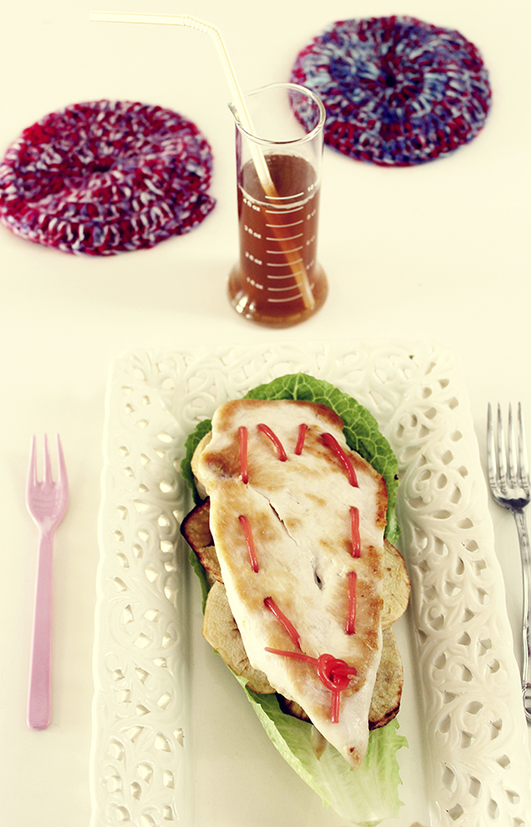 Mientras cocinamos los filetes a la plancha, bien hechos con un toque doradito. Dejamos entibiar o enfriar. Y ahora montamos de la siguiente manera; Cogemos 1 filete de pollo más un cordón de regaliz, con la brocheta vamos agujereando e introduciendo el cordón por el agujero (como si cosiéramos). Hacerlo solo en cuatro filetes.