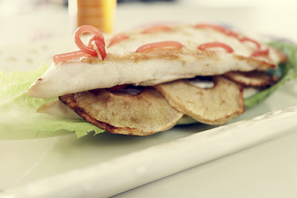 Los otros 4 filetes los colocamos sobre una hoja de lechuga (limpia y seca), cada filete con su hoja, les untamos una cucharada de queso, encima; espolvoreamos 1 cdta. albahaca, 1/2 cdta. de pimienta negra y 1 pizca de sal de cocó, además de 1 cda. de cebolla frita. Sobre esto le colocamos las rodajas de manzana (1/2 manzana por comensal). Así hasta finalizar los 4 filetes.