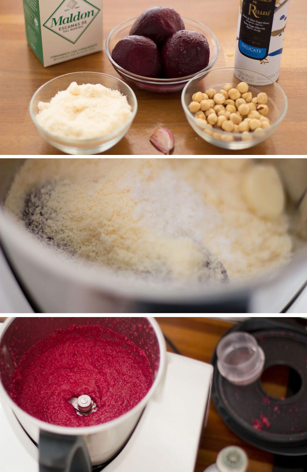 Picamos las remolachas, el ajo, las avellanas, el queso y la sal en la picadora. Con la picadora funcionando le añadimos poco a poco el aceite de oliva. Y listo!